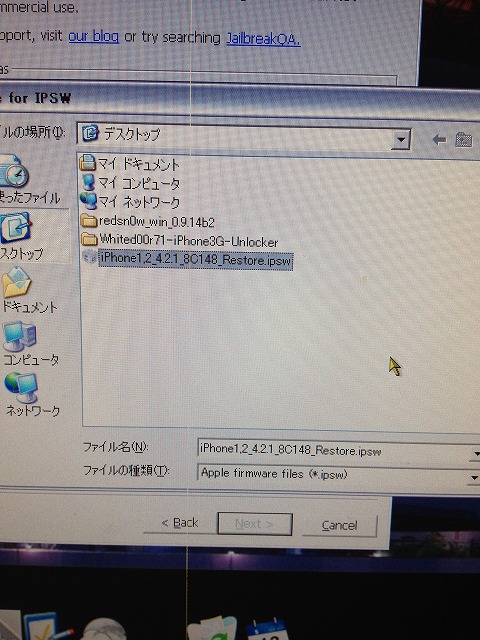 3、下段の「Extras」→「Select IPSW」→ダウンロードしたiPhone1.2_4.2.1_8C148~を選んで「開く」をクリック